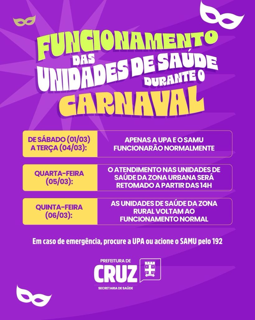 A Prefeitura de Cruz das Almas informa que, durante o período de Carnaval, o atendimento ao público nas repartições municipais e os serviços de saúde seguirão um cronograma especial.