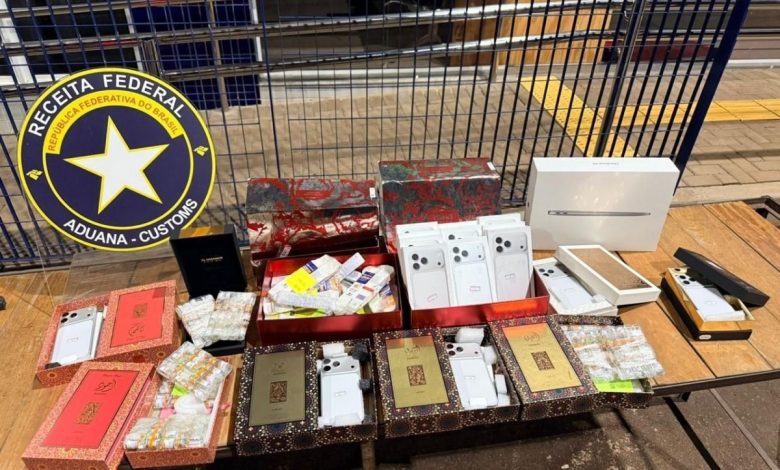Durante a inspeção, foi localizada, no bagageiro, uma mala com itens pessoais e perfumes. Dentro do compartimento, os agentes encontraram 150 frascos do medicamento tirzepatida, caneta emagrecedora mais conhecida como Mounjaro, 10 iPhones 17 Pro Max e um MacBook Air, todos escondidos nas caixas de perfumes, em mais uma tentativa de burlar a fiscalização.