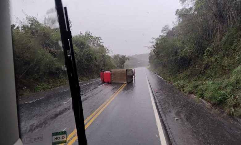Um caminhão tombou na tarde desta segunda-feira, na BR-101, no trecho da Pedra do Cavalo, em Governador Mangabeira. O acidente deixou o motorista do veículo ferido.