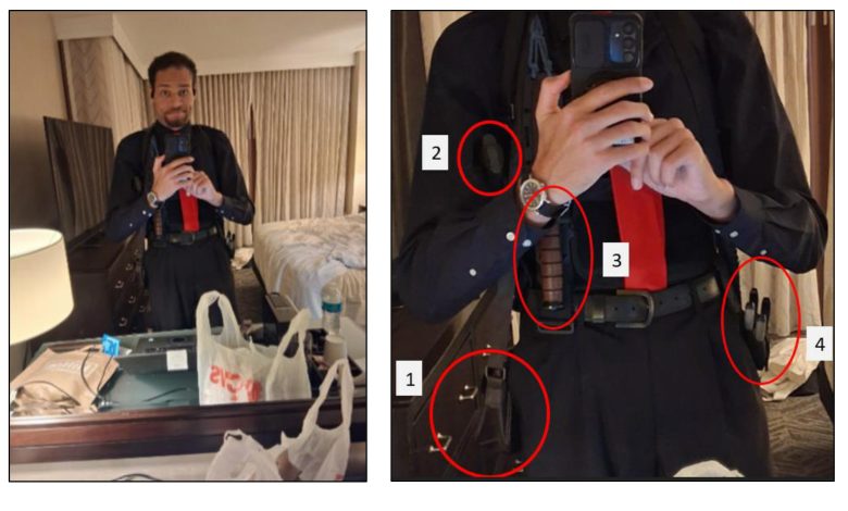 Na imagem, Cole Tomas Allen estava equipado com uma bolsa de munição, um coldre de arma no ombro e uma faca. Ele vestia calça preta, camisa preta e gravata vermelha ao fazer a imagem em seu quarto no hotel Washington Hilton, local onde Trump e centenas de jornalistas participavam de um jantar de gala na noite de sábado (25).