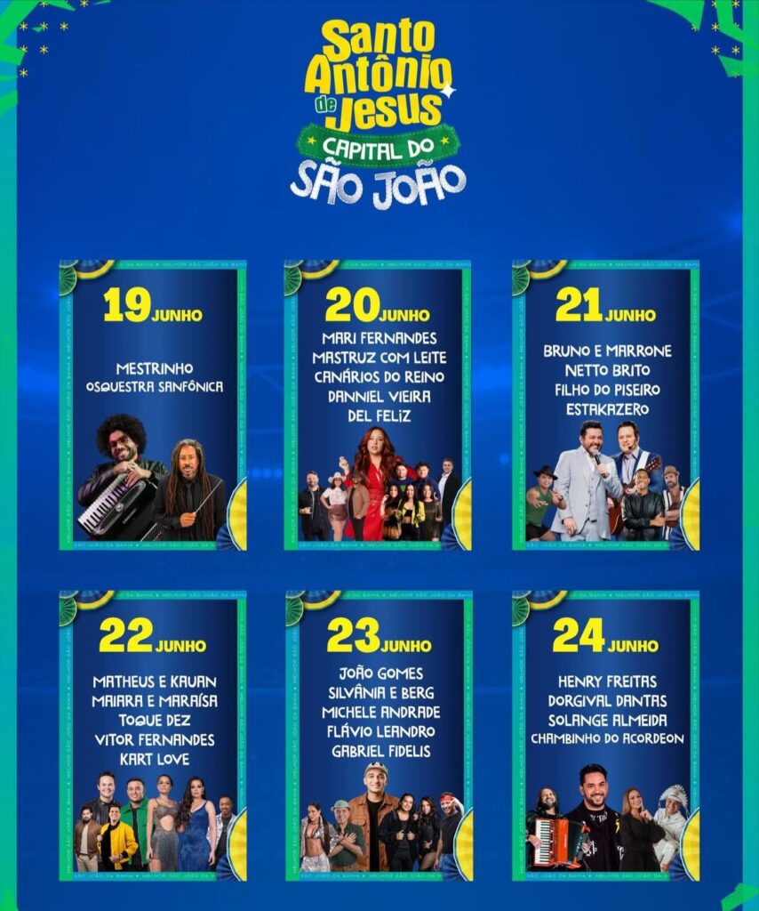 Os dias e a ordem dos shows do São João 2026 de Santo Antônio de Jesus foram divulgados nesta segunda-feira, 20. O anúncio foi feito pela Prefeitura através das redes sociais. Serão cinco dias de festa com diferentes estilos musicais. Confira abaixo.