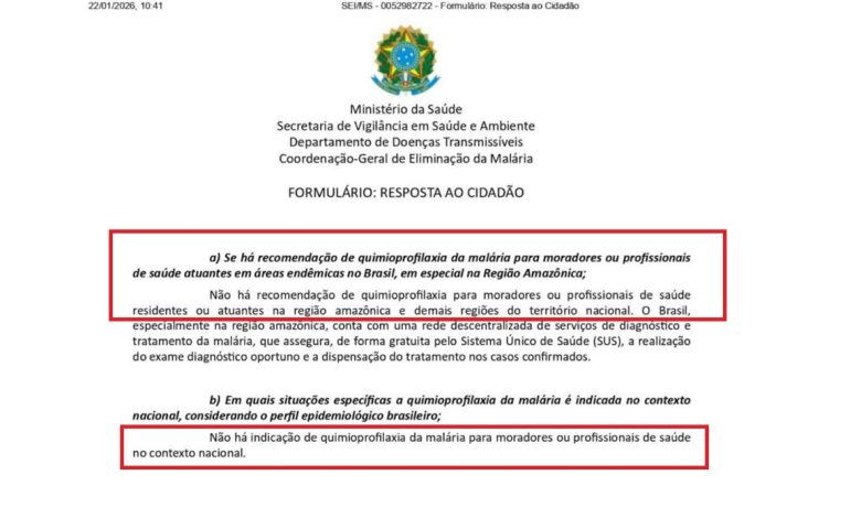 A resposta, enviada em documento protocolado pela Coordenação-Geral da Eliminação da Malária, da Secretaria de Vigilância em Saúde e Ambiente, foi a seguinte:
